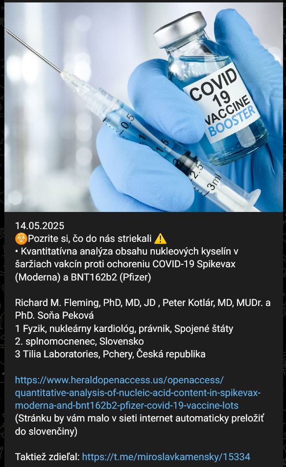 Taktiež zdieľal: https://t.me/miroslavkamensky/15334 Zdroj https://t.me/russianews12/16678 z 14.05.2025Kvantitatívna analýza obsahu nukleových kyselín v šaržiach vakcín proti ochoreniu COVID-19 Spikevax (Moderna) a BNT162b2 (Pfizer)