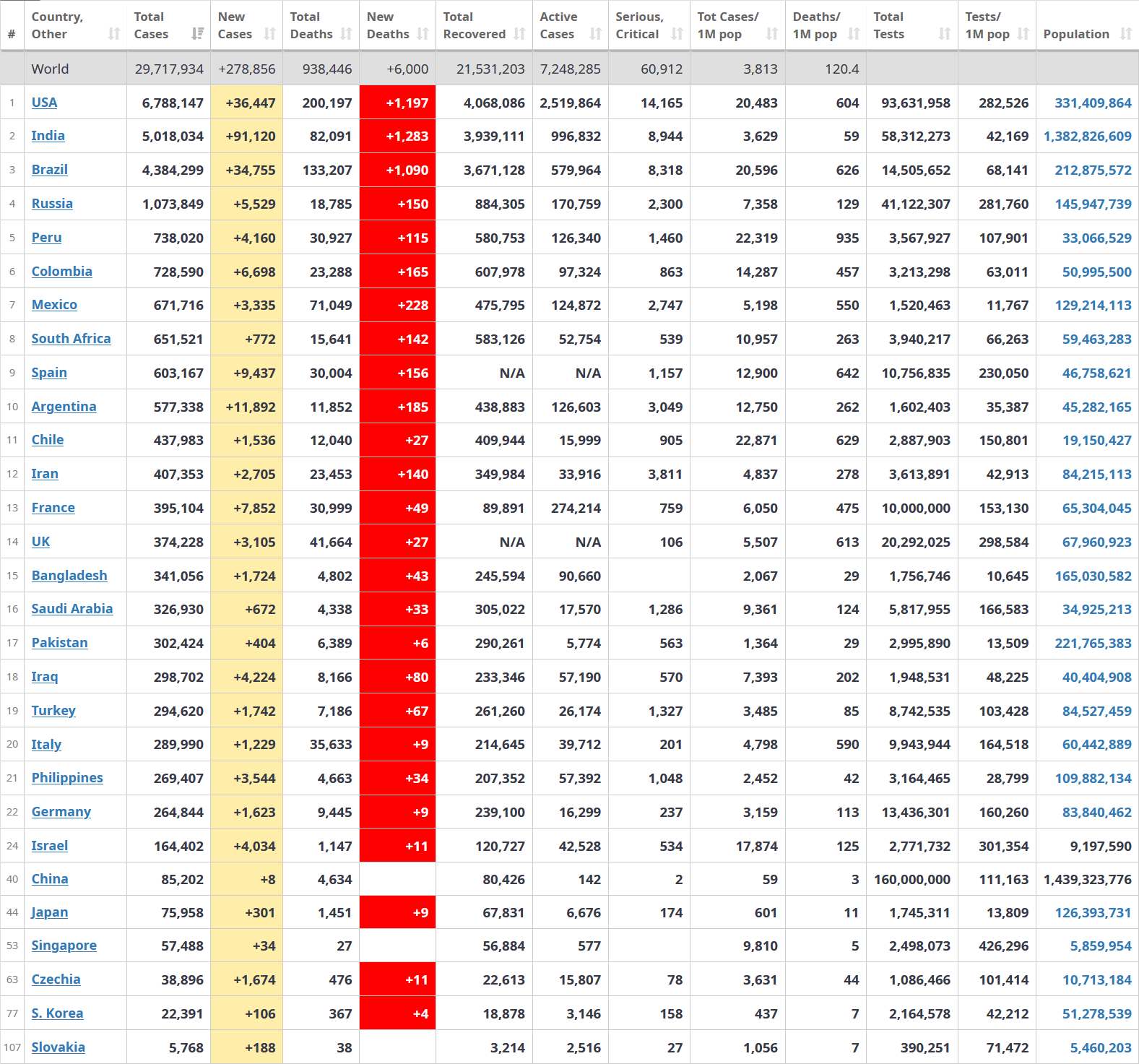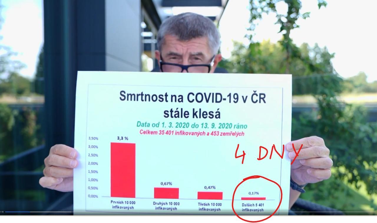 Poněkud aktuálnější obrázek. Ten čtvrtý sloupeček má dneska už 0,47%. Od začátku září 55 mrtvých. To je 11,5% celkově (za 14 dní) a z vyléčených to je 1,4%. Počet mrtvých se neudává z aktuálně nakažených, ale z vyléčených - ale politikové pak můžou ukazovat lepší čísla než jsou ve skutečnosti.