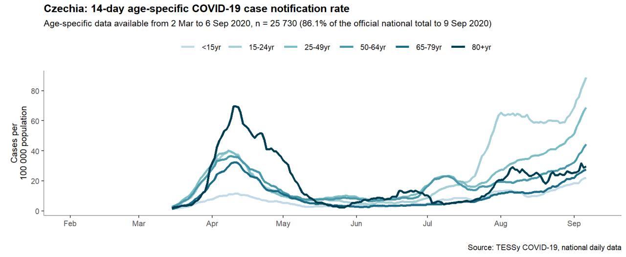 Sledujte nárůst u adolescentů, jak pak šli k prarodičům bez roušek a nakazili je. Obrázek je odsud: https://covid19-country-overviews.ecdc.europa.eu/
