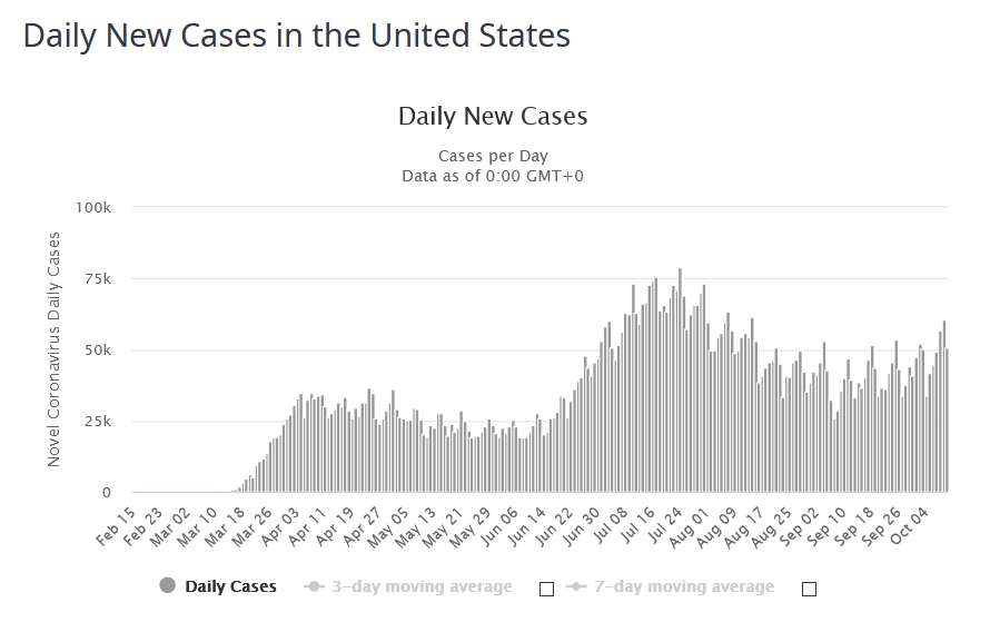 Prediktivní model vývoje epidemie v České republice. Ústav ve svém prediktivním modelu počítal v období od 1. do 15. října v nejoptimističtější variantě s průměrem 2420 nově nakažených denně. V nejhorším výhledu pak počítal s denním nárůstem 4809 potvrzených případů. Skutečný průměr je však už nyní (od 1. do 9. října) 4290 a poslední čtyři dny se nárůsty výrazně zvyšují.
