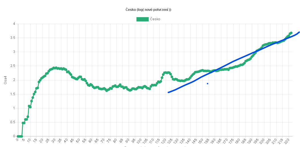 Pan Ex-Prezident má bohužel jedinou pravdu v tom, že se nejedná o exponenciální růst. Tady jsou vyhlazené denní přírůstky v logaritnické stupnici o základu 10. Tedy 2 je 100, 3 je 1000, 4 10.000. Modrá čára je proložení, středem grafu z poslední doby. Pokud aktuální hodnoty jsou nad tuto čáru, průběh je horší než exponenciální, pokud jsou přesně na čáře, je právě exponenciální a pokud pod čárou, tak méně než exponenciální růst = ano, bude líp.