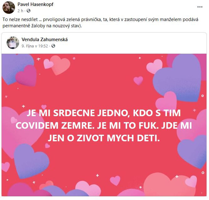 „To nelze nesdílet... prvoligová zelená právnička (ta, která v zastoupení svým manželem podává permanentní žaloby na nouzový stav),“ poznamenal Hasenkopf.