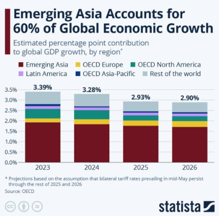 Jak ukazuje graf webu Statista, rozvíjející se Asie, která zahrnuje Čínu, Indii a Indonésii, jakož i Hongkong, Malajsii, Filipíny, Singapur, Tchaj-wan, Thajsko a Vietnam, zůstává motorem světového hospodářského růstu, přičemž její role je v prostředí vysokých cel ještě výraznější než v předchozích letech.