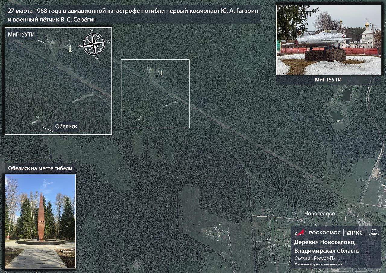MiG-15UTI vzlietol z letiska Čkalovskij (Чкаловский) pri Moskve. V čase štartu boli podmienky viditeľnosti normálne - spodný okraj mrakov bol vo výške 900m nad zemou. Splnenie úlohy v cvičnej zóne mala trvať okolo 20 minút, ale po 4 minútach Gagarin oznámil koniec misie a požiadal o povolenie otočiť sa a letieť späť na základňu. Potom sa komunikácia s lietadlom prerušila. O 14:50 jeden z vrtuľníkov našiel vrak lietadla pri obci Novosjolovo (Новосёлово). Nasledujúce ráno sa našiel útržok Gagarinovej leteckej bundy s kupónmi na jedlo. Neskôr sa našla peňaženka s vodičským preukazom a fotografiou Koroljova (Королёва). Pomník bol odhalený v Novosjolovke 06.08.1976. Pamätník vytvorili architekti z červenej žuly; základom kompozície pamätníka je obelisk vysoký 16 metrov. Ľudia prichádzajú k pamätníku v zime i v lete, aby si minútou smútočného ticha uctili pamiatku hrdinov a v tichu lesa pred pamätníkom si zaspomínali na ich odvahu a statočnosť. Zdroj https://vk.com/wall-30315369_566918 z 27.03.2023