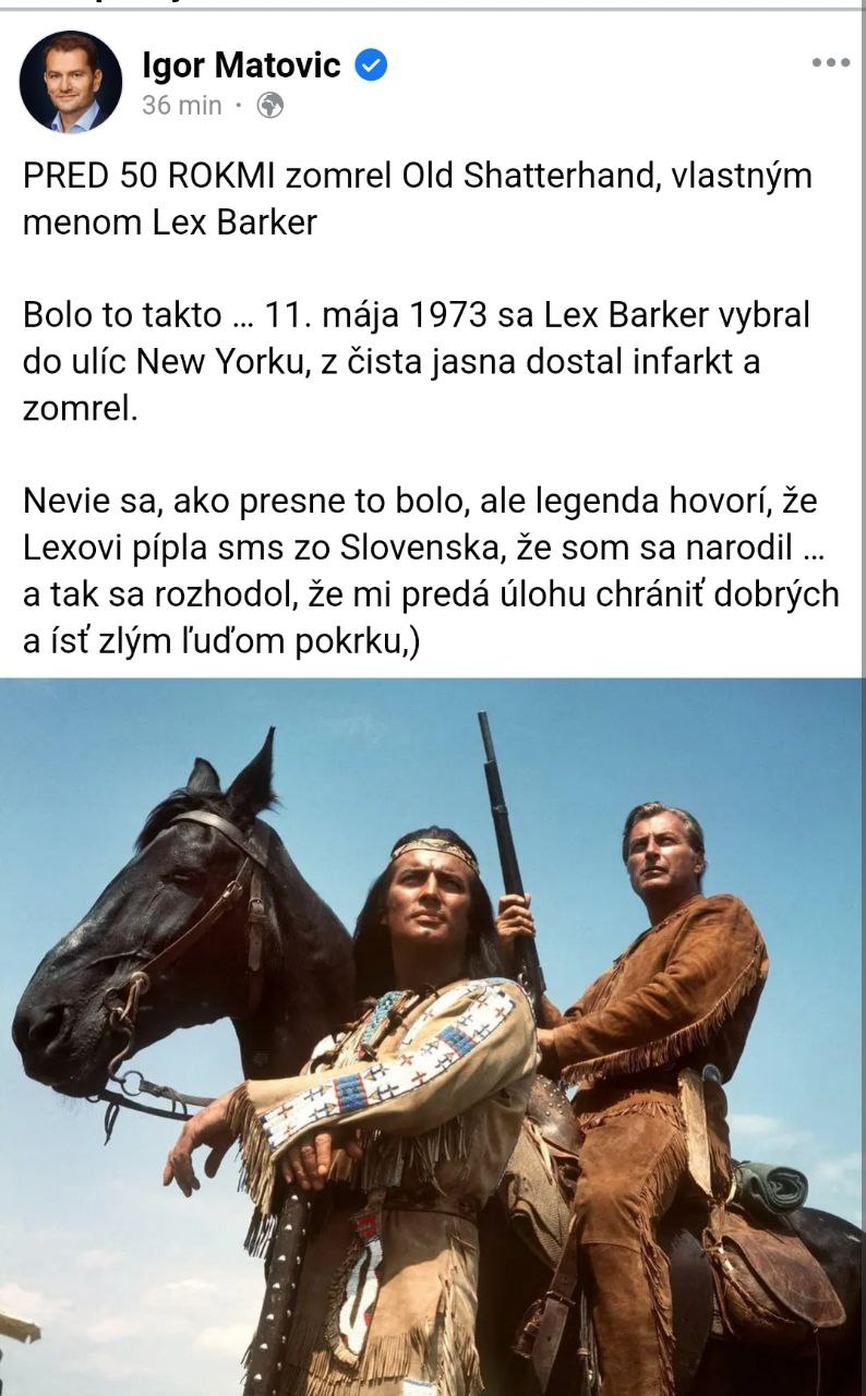 .....tak nám ten náš trnafský trulo trafený tehlou pripomenul, že pred 50 rokmi zomrel Lex Barker (vlastným menom Alexander Crichlow Barker, Jr., * 8. máj 1919, New York, New York, USA – † 11. máj 1973, New York) - americký herec, známy najmä ako predstaviteľ filmového Old Shatterhanda zo série západonemeckých filmov nakrútených v 60. rokoch na motívy kníh Karla Maya.