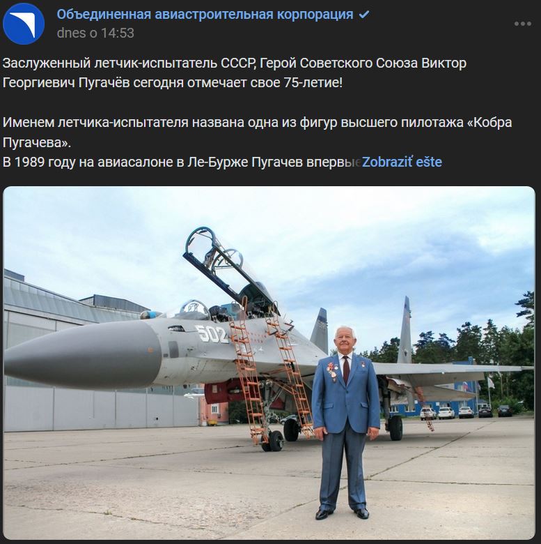 Zaslúžilý skúšobný pilot ZSSR, Hrdina Sovietskeho zväzu Viktor Georgievič Pugačev (Виктор Георгиевич Пугачёв) dnes oslavuje 75. narodeniny! (nar. 08.08.1948). Po skúšobnom pilotovi je pomenovaná jedna z akrobatických figúr "Pugačevova kobra" (Кобра Пугачева). V roku 1989 na leteckej prehliadke v Le Bourget Pugačev po prvý raz verejne demonštroval možnosť vykonať núdzové zníženie rýchlosti na vysoko manévrovateľnom lietadle Su-27 (Су-27) v dôsledku dosiahnutia veľkých uhlov nábehu vypnutím / vyradením pozdĺžnej stability stroja a pritiahnutím knipla na seba. Viktor Pugačev je držiteľom viacerých svetových rekordov vytvorených na lietadle Su-27 (Су-27). Lietal na lietadlách MiG-31 (МиГ-31), MiG-25 (МиГ-25), Su-25 (Су-25), Su-27 (Су-27), Su-33 (Су-33) a ďalších.