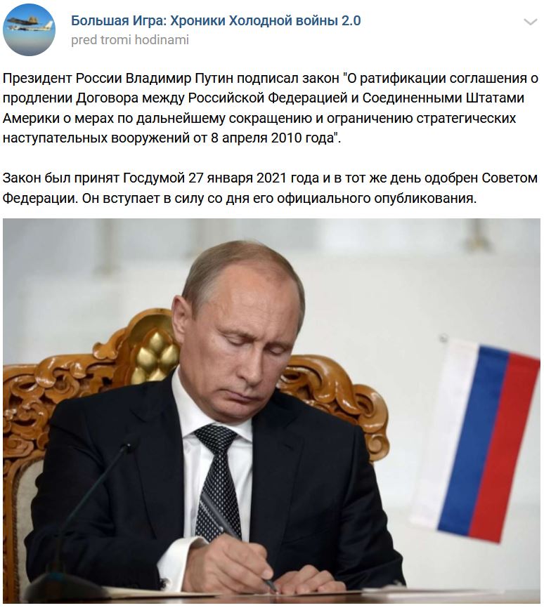 ↑ Ruský prezident Vladimir Putin podpísal zákon "o ratifikácii dohody o predĺžení zmluvy medzi Ruskou federáciou a USA o opatreniach na ďalšie zníženie a obmedzenie strategických útočných zbraní z 08.04.2010". Zákon bol prijatý Štátnou dumou 27.01.2021 a schválený Radou federácie v ten istý deň. Nadobúda účinnosť dňom jeho oficiálneho uverejnenia. Mala by teda platiť do 05.02.2026.