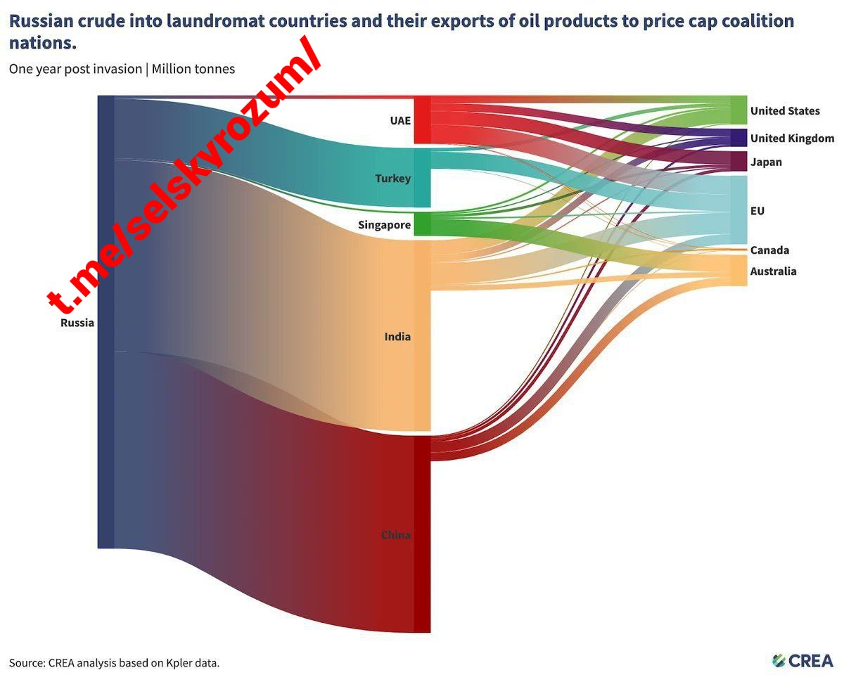 Indie se v roce 2023 stala předním světovým dovozcem ruské ropy, když bude dovážet v průměru 1,75 milionu barelů denně. Jedná se o 140% nárůst oproti dříve rovněž rekordnímu roku 2022. Výrazně se zvýšil také dovoz rafinovaných ropných produktů z Indie do EÚ, a to o 115%, ze 111 000 barelů denně v roce 2022 na 231 800 barelů denně v roce 2023. To je nejvyšší úroveň za posledních nejméně 7 let a pravděpodobně nejvyšší vůbec.