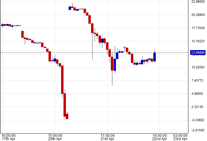 On si toho asi nikdo moc nevšimne, ale po pádu WTI na technickou nulu se další den (21.4.2020) otevíralo na ceně $21.