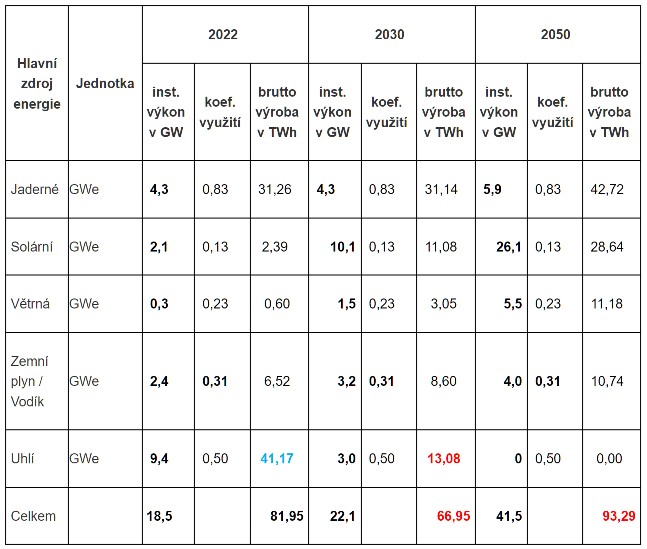 Výroba elektřiny by v roce 2030 kvůli 6,4 GW výkonu z uhlí prudce klesla, přičemž i v tabulce uvedená výsledná brutto produkce 66,95 TWh musí být ještě ponížena zhruba o 10 TWh kvůli vlastní spotřebě elektřiny v elektrárnách a ztrátám v síti. Navíc se samozřejmě sčítá celoroční produkce z OZE a účelově se pomíjí fakt, že například v lednu 2023 tehdejší kapacita 2,5 GW v solárních zdrojích dle statistiky Energetického regulačního úřadu vyrobila pouhý podíl 0,6 % z celkové bilance elektroenergetiky. Pětinásobek plánovaného výkonu ve FVE v roce 2030 by při projekci na reálnou situaci ledna 2023 přinesl jen 3 % elektřiny, pětinásobek z větru 5 %. Ovšem snížením výkonu znuhlí z 9,4 GW v roce 2022 na pouhé 3 GW by znamenal výpadek výroby elektřiny v lednu 2030 o 68 procent a pětinásobek OZE by z toho nahradil jen 8 %! V tabulce a NKEP uvažovanou jednu velkou paroplynovou elektrárnu navíc kvůli chybějícím dotacím a neexistujícím kapacitním platbám v Česku nikdo do roku 2030 nepostaví. Ovšem uhelné zdroje mohou vinou drahých povolenek skončit už v roce 2025. S tímto plánem slepě přijímajícím unijní dekarbonizační požadavky (které Německo, samotná vedoucí země zelené tranzice EU, jak uvedeno výše, sama neplní) by Česká republika spáchala doslova energetickou a tím také sociálně-ekonomickou sebevraždu.