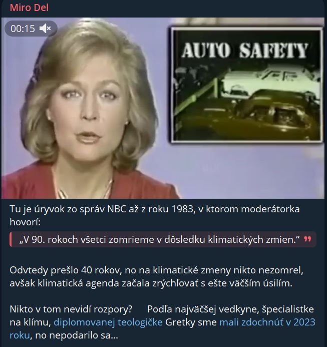 Odvtedy prešlo 40 rokov, no na klimatické zmeny nikto nezomrel, avšak klimatická agenda začala zrýchľovať s ešte väčším úsilím. Nikto v tom nevidí rozpory? Podľa najväčšej vedkyne, špecialistke na klímu, diplomovanej teologičke (https://t.me/Miro_Del/12022) Gretky sme mali zdochnúť v 2023 roku (https://t.me/Miro_Del/19371), no nepodarilo sa...