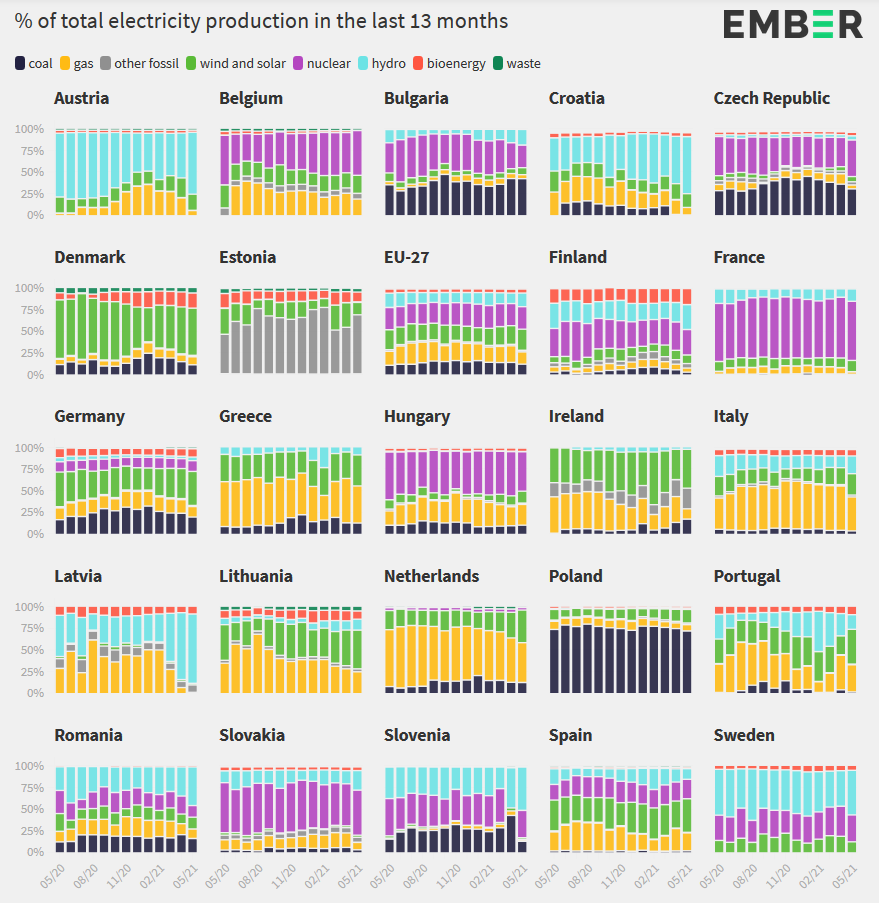 Podíl různých zdrojů na výrobě elektřiny v květnu 2020 až květnu 2021. Zdroj: Ember 3. Pestobarevná energetika