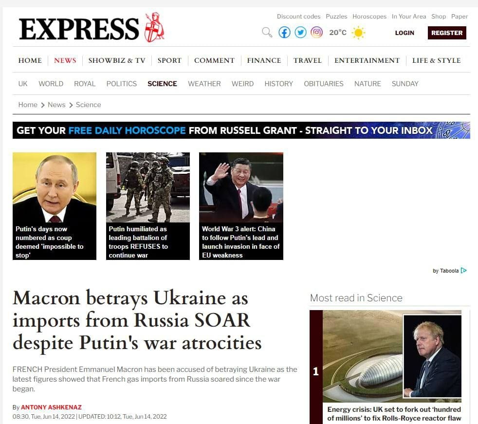 „Macron zrádza Ukrajinu, keďže dovoz z Ruska stúpa napriek Putinovým vojenským zverstvám,“ hlási titulok v „The Daily Express“.