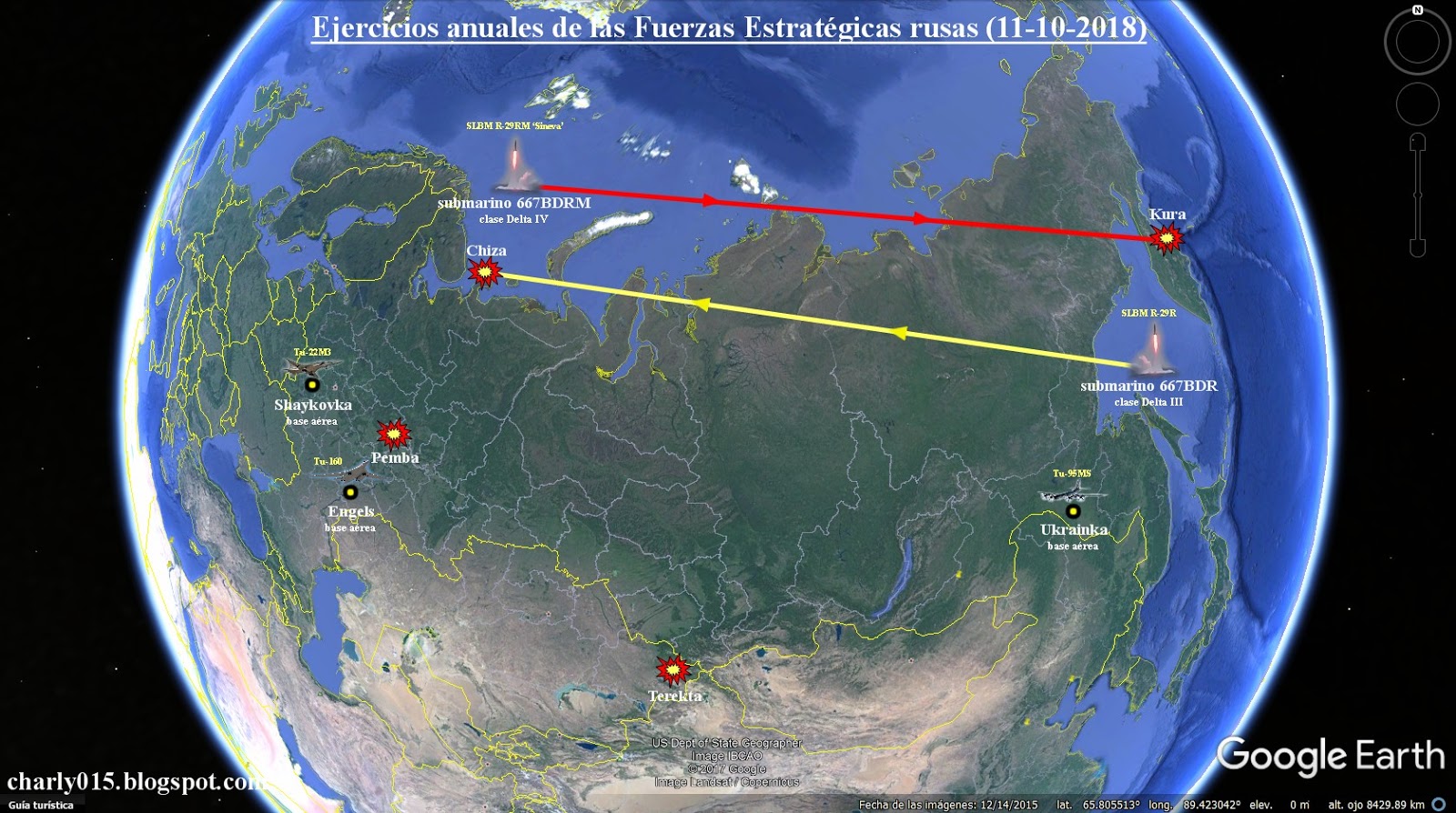 ↑ Cvičenie strategických síl 11.10.2018 - miesta štartov lietadiel + približné miesta štartov balistických rakiet z ponoriek a smery ich letu podľa blogera Charly015: