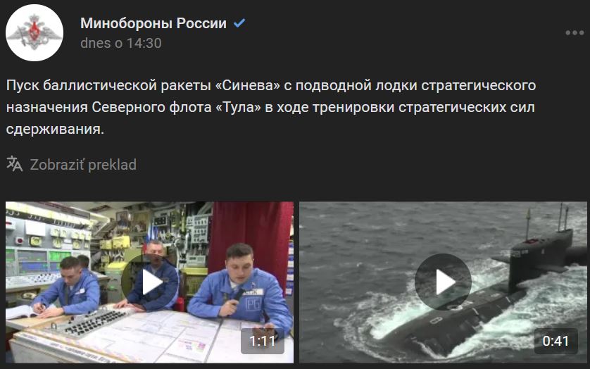 Štart balistickej rakety Sineva (Синева) zo strategickej ponorky Severnej flotily Tula (Тула) počas cvičenia strategického odstrašovania. Zdroj https://vk.com/wall-133441491_948617 z 26.10.2022