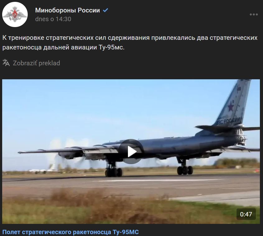 Na výcviku síl strategického odstrašenia sa podieľali 2 lietadlá Tupolev Tu-95MS (Ту-95мс) Zdroj https://vk.com/wall-133441491_948618 z 26.10.2022