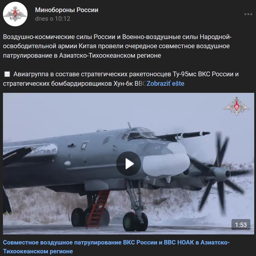 Vzdušno-kozmické sily (VKS) Ruska a vzdušné sily Čínskej ľudovej oslobodzovacej armády vykonali ďalšiu spoločnú leteckú hliadku v ázijsko-tichomorskom regióne. Letecká skupina strategiských Tupolev Tu-95MS (Ту-95мс) VKS Ruska a strategické bombardéry Xian H-6K VVS Číny podnikali letecké hliadky vo vodách Japonského a Východočínskeho mora. Doba letu ruských strategických raketových nosičov bol približne 8 hodín. Stíhacie lietadlá Suchoj Su-30SM (Су-30см) a Su-35S (Су-35с) VKS Ruska poskytli leteckej skupine sprievod. Prvýkrát v rámci spoločných leteckých hliadok pristáli ruské lietadlá na letisku v Čínskej ľudovej republike a čínske lietadlá na letisku v Ruskej federácii. Na niektorých úsekoch trasy sprevádzali strategické raketové nosiče zahraniční piloti. Pri plnení svojich úloh lietadlá oboch krajín konali prísne v súlade s ustanoveniami medzinárodného práva. Nedošlo k narušeniu cudzieho vzdušného priestoru. Po ukončení spoločnej leteckej hliadky sa všetky zúčastnené lietadlá vrátia na svoje domovské letiská. Cvičenie sa uskutočnilo v rámci vykonávania ustanovení plánu vojenskej spolupráce na rok 2022 a nie je namierené proti tretím krajinám.