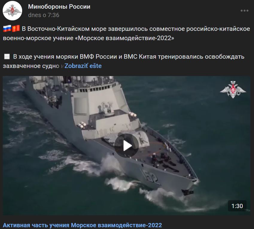 Vo Východočínskom mori sa skončilo spoločné rusko-čínske námorné cvičenie "Námorná spolupráca 2022" (Морское взаимодействие-2022). Počas cvičenia námorníci VMF Ruská a VMF Číny cvičili oslobodenie uneseného plavidla a zdokonaľovanie spoločných pátracích a záchranných akcií na mori, vykonávali spoločné taktické manévrovanie a komunikačné cvičenia. Lode oboch krajín s podporou protiponorkového letectva spoločne hľadali ponorku fiktívneho nepriateľa a vystrelili salvu hĺbkových náloží. Delostrelecká paľba bola vedená na cieľ simulujúci hladinovú vojnovú loď a protilietadlové rakety a delostrelectvo zasiahli vzdušné ciele. Celkovo bolo počas cvičebného obdobia spoločne vykonaných viac ako 10 bojových cvičení. Po ukončení cvičebného programu usporiadali posádky ruských a čínskych vojnových lodí rozlúčkový obrad na mori, počas ktorého sa lode oboch krajín zoradili do formácie a navzájom sa pozdravovali zvukovými signálmi a každá si stanovila svoj vlastný kurz.