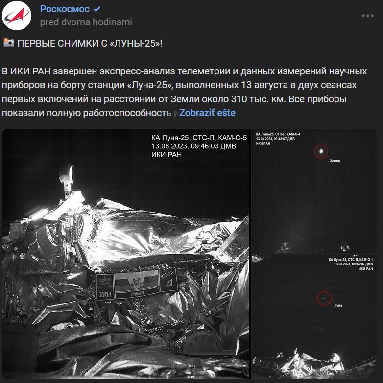 V IKI RAN (ИКИ РАН) dokončili expresnú analýzu telemetrických a meracích údajov vedeckých prístrojov na palube stanice Luna-25, ktorá sa uskutočnila v nedeľu 13.08.2023 v dvoch reláciách prvých aktivácií vo vzdialenosti od Zeme približne 310 tisíc km. Všetky prístroje preukázali plnú funkčnosť a pripravenosť na výskum Mesiaca. Ich analógové a digitálne uzly a bloky pracovali "perfektne" ("otlično"). Kamery na pulube STS-L (СТС-Л) urobili prvé zábery z vesmíru, ktoré sa zapíšu do histórie národnej kozmonautiky. Tieto zábery zobrazujú prvky konštrukcie kozmickej lode na pozadí Zeme, z ktorej sme už navždy odleteli, a na pozadí Mesiaca, na ktorý čoskoro dorazíme. Tretí obrázok zobrazuje emblém misie a vedro/kôš palubného manipulátora.