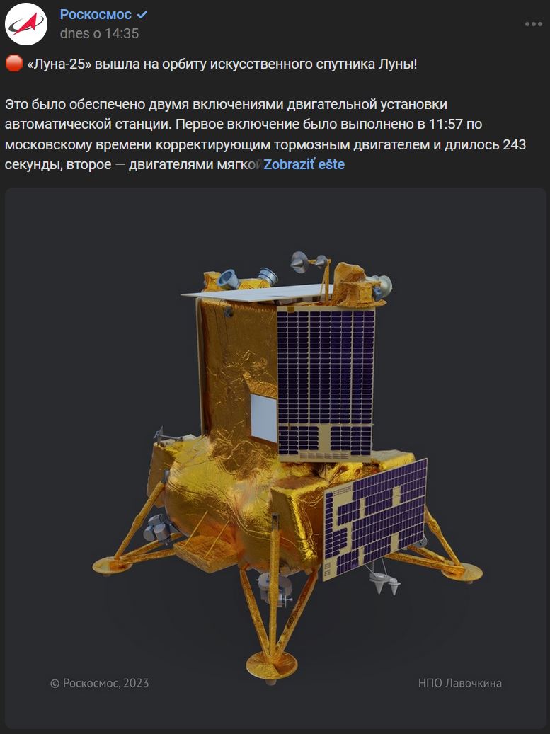 Luna-25 (Луна-25) vstúpila na obežnú dráhu Mesiaca