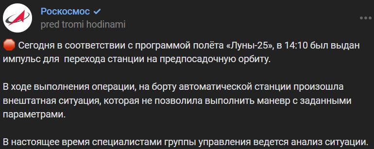 V sobotu 19.08.2023 v súlade s letovým programom Luny-25 bol o 14:10 hod. v súlade s letovým programom vydaný impulz na prechod stanice na pred-pristávaciu obežnú dráhu. Počas vyplnenia operácie nastala na palube automatickej stanice mimoriadna situácia, ktorá neumožnila vykonať manéver so stanovenými parametrami. V súčasnosti špecialisti kontrolnej skupiny analyzujú situáciu.