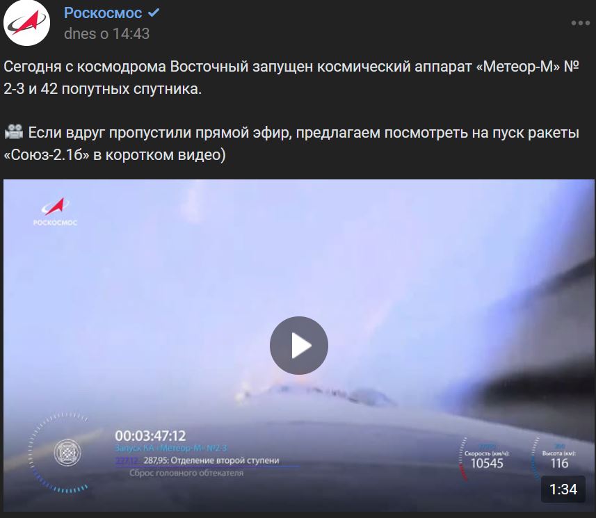 Združený náklad 39 ruských a 3 zahraničných družíc bol dopravený na cieľové dráhy a oddelený od horného pomocnéo stupňa Fregat, ktorú dnes vyniesla nosná raketa Sojuz-2.1b z Vostočného. Ak vezmeme do úvahy aj hydrometeorologickú družicu Meteor-M č. 2-3, ktorá bola vypustená na obežnú dráhu, súčasné vypustenie toľkých ruských satelitov je rekordom v histórii ruskej kozmonautiky! Viac informácií o družiciach nájdete na https://www.roscosmos.ru/39352/.