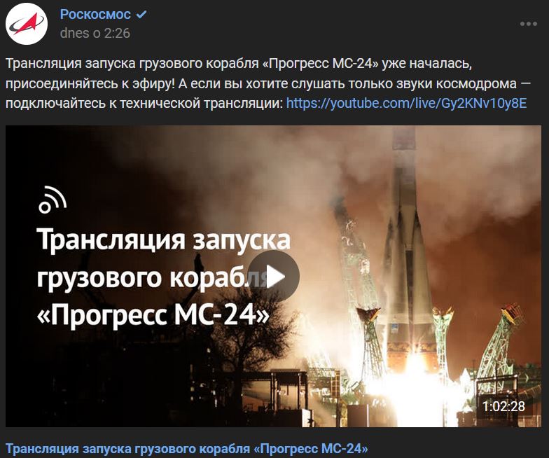 Streda 23.08.2023 o 04:08 hod. MSK odštartoval z Bajkonuru Sojuz-2.1a (Союз-2.1а) s novou nákladnou loďou Progress MS-24 (Прогресс МС-24). Vynesenie "Progress MS-24" na určenú obežnú dráhu, oddelenie od 3. stupňa rakety, otvorenie antén a solárnych panelov kozmickej lode prebehlo bez problémov! Pripojenie Progress MS-24 k modulu Zvezda (Звезда) ruského segmentu MKS - v piatok 25.08.2023 o 06:50 hod. MSK.
