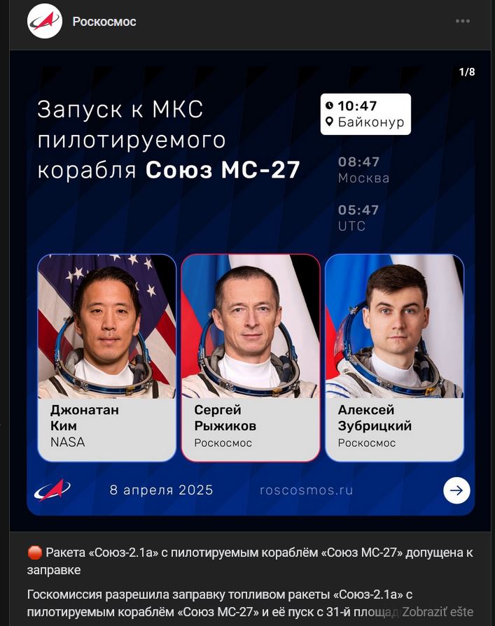 Zdroj https://vk.com/wall-30315369_584446 z 08.04.2025 + 8 infografík o nosnej rakete, trase letu k MKS a videá