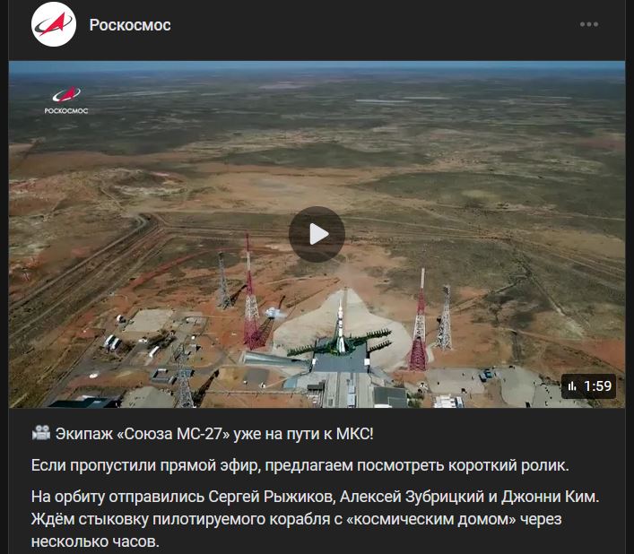 Utorok 08.04.2025, Kazachstan Bajkonur (Байконур), o 08:47 hod. MSK štart nosnej rakety Sojuz-2.1a (Союз-2.1а = motory РД-107А/РД-108А) s pilotovanou loďou Sojuz MS-27 (Союз МС-27)