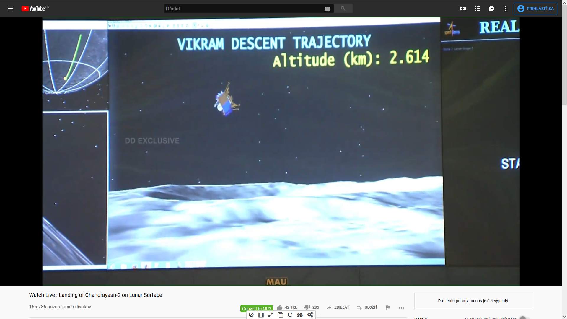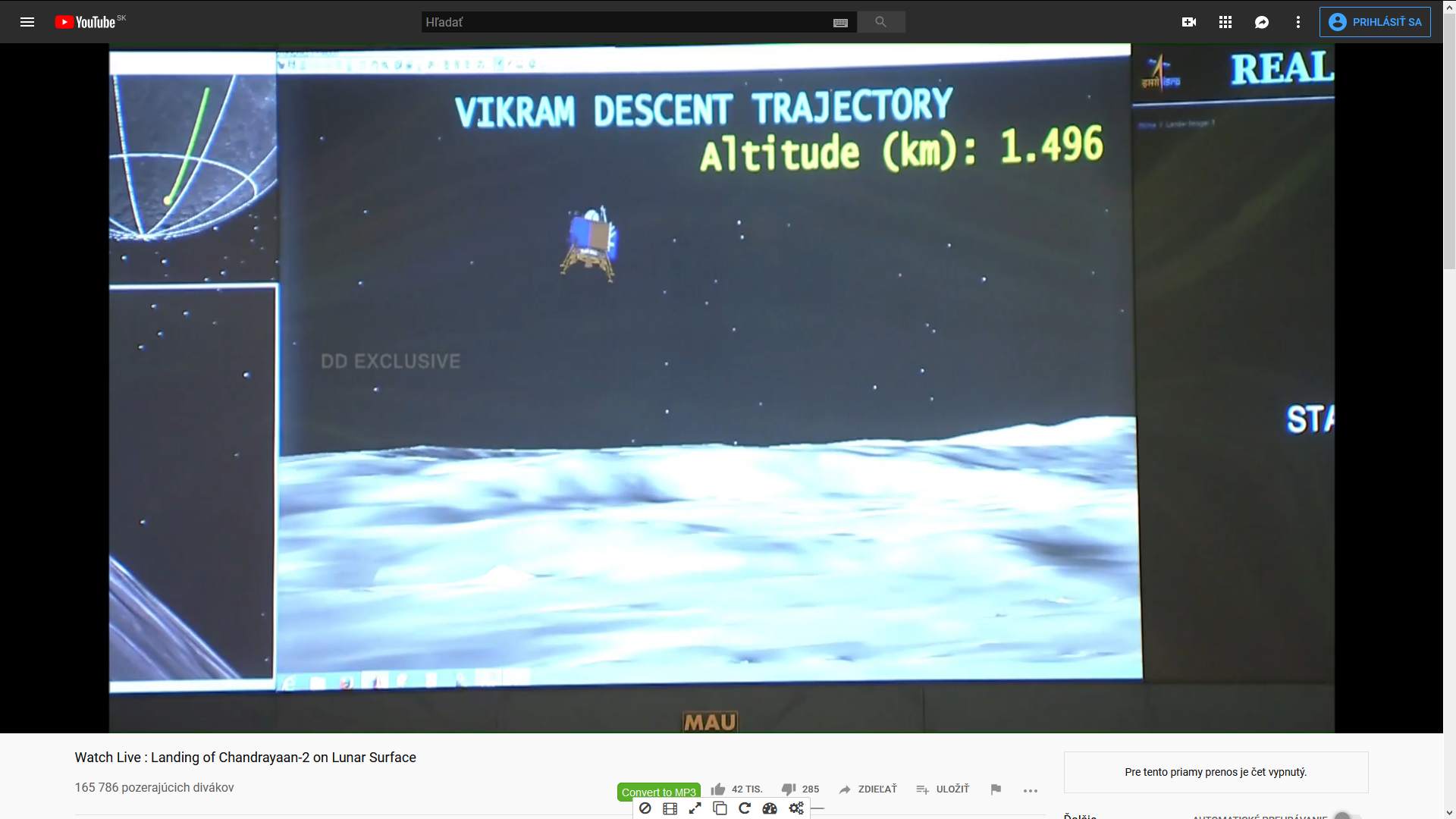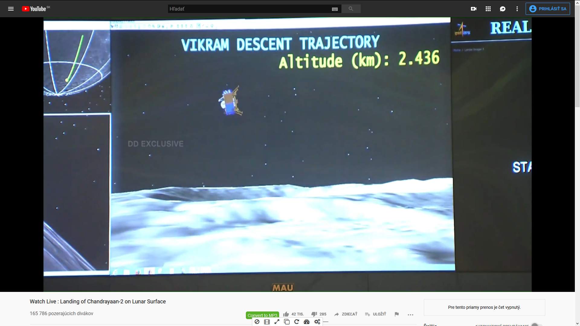 Historická udalosť - indický pokus o pristátie na Mesiaci - modul Vikram sondy Čandraján-2
