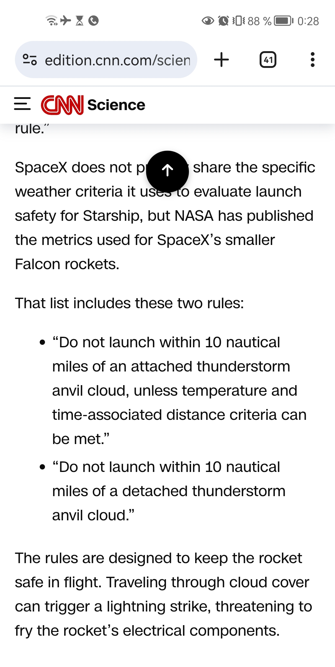 Na dnešné okno je zatiaľ za počasie 45% na go... 70min do teoretického štartu. Bude závisieť zase od aktuálnej oblačnosti a pravdepodobnosti bleskov (na základe pravidiel z 1970, kedy na blesky skoro doplatil program Apollo)