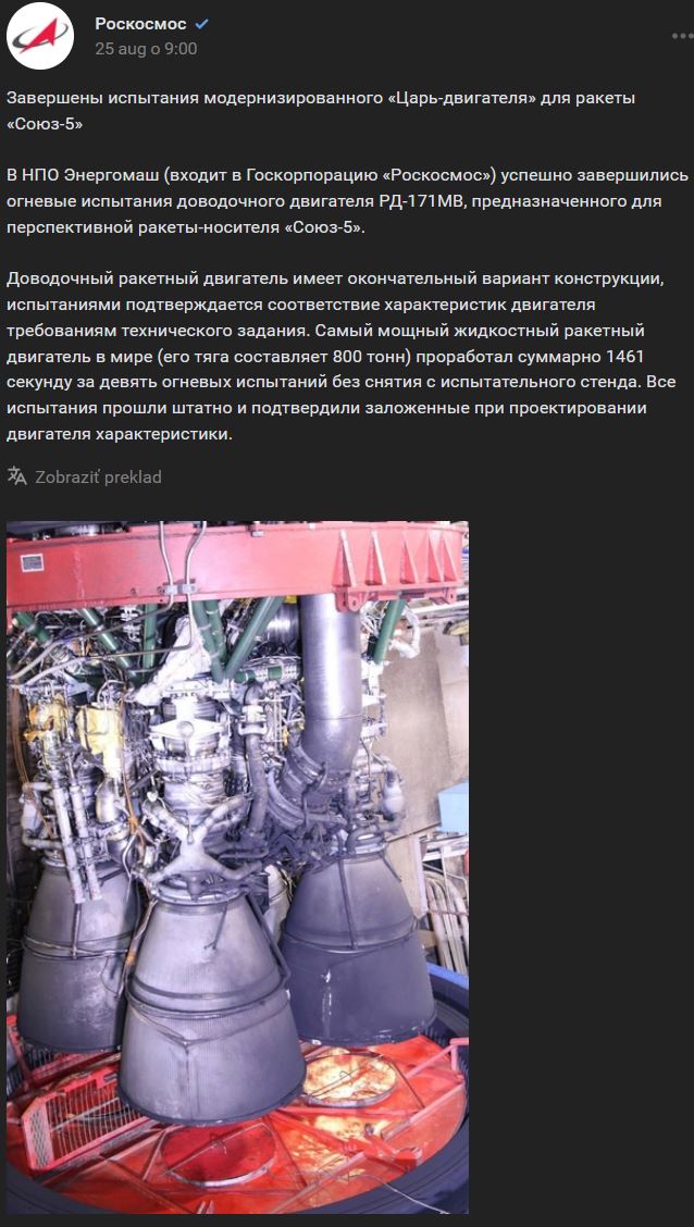 Ukončili sa skúšky/testy motora RD-171MV (РД-171МВ), ktorý vyvinula spoločnosť NPO Energomaš (НПО Энергомаш). Jeho ťah je 806 ton, čo je rekord medzi raketovými motormi na kvapalné palivo.