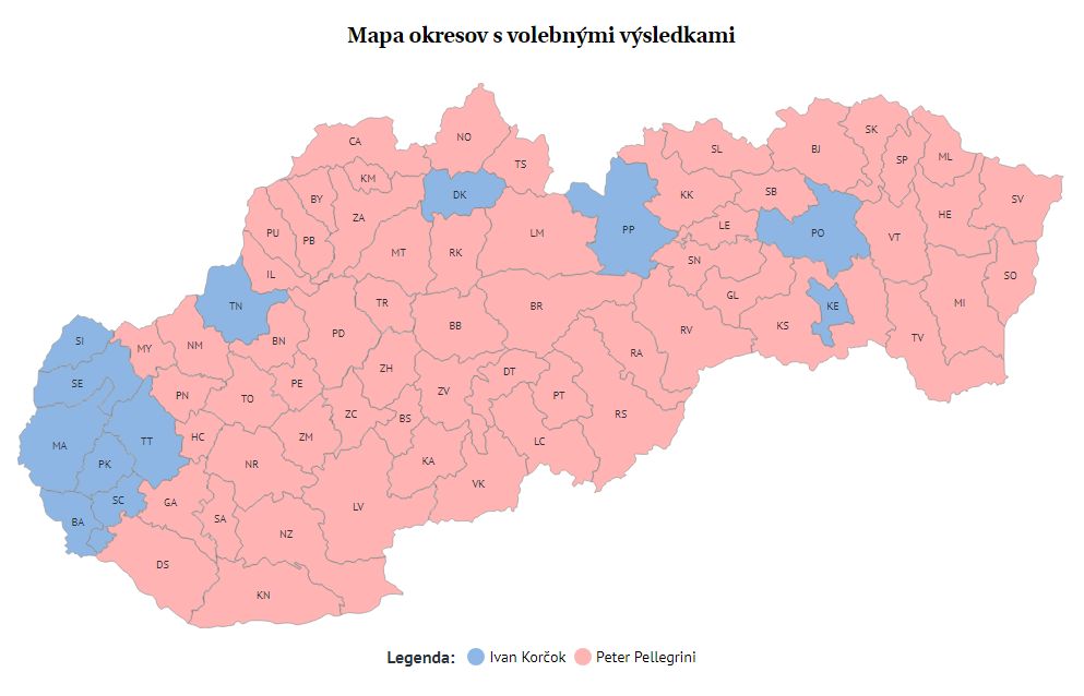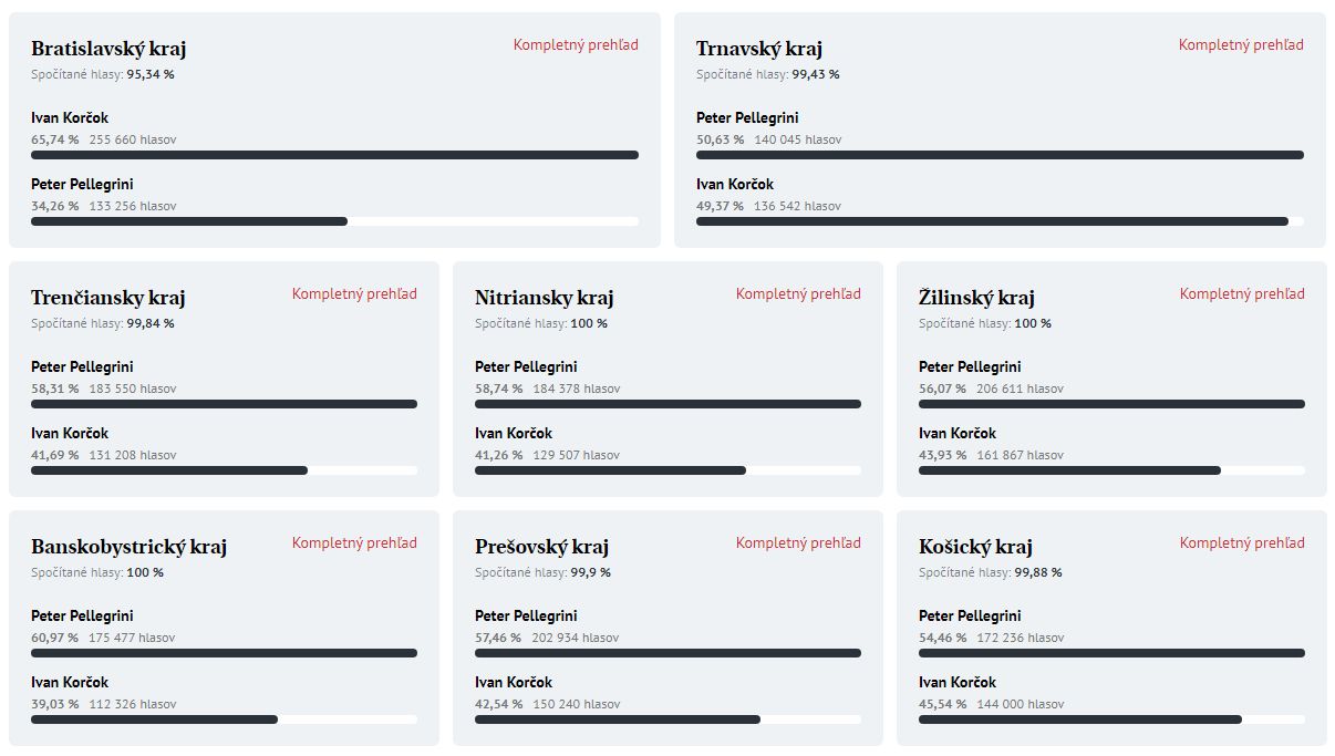 Novým prezidentom Slovenskej republiky bude líder Hlasu a predseda parlamentu Peter Pellegrini. Druhé kolo volieb neprenieslo tesný súboj, aký predikovali prieskumné agentúry či odborníci. Pellegrini podľa priebežných výsledkov vedie pred Ivanom Korčokom o viac ako 180-tisíc hlasov a smeruje k pomerne jasnému víťazstvu. Volebná účasť v druhom kole je ešte vyššia ako v tom prvom a prekročila 60 %, čo je najviac v druhých kolách za posledných 25 rokov.