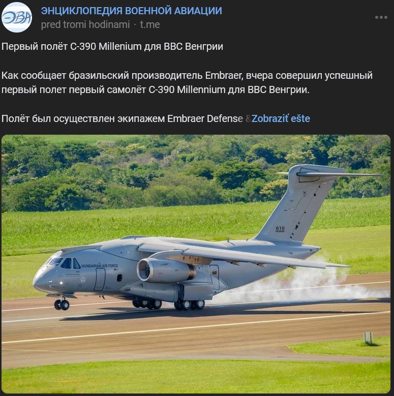 Podľa brazílskeho výrobcu Embraer prvé lietadlo C-390 Millenium pre maďarské vzdušné sily uskutočnilo úspešný prvý let vo štvrtok 08.02.2024. Let vykonala posádka spoločnosti "Embraer Defence & Security" v Gavian Peixotu, kde sa nachádza výrobný závod Embraer. Let trval 4 hodiny, počas ktorých bolo lietadlo testované pred odovzdaním maďarským vzdušným silám. V 11/2020 maďarská vláda podpísala so spoločnosťou Embraer zmluvu o kúpe 2 lietadiel C-390. Lietadlá pre maďarské obranné sily budú mať vo svojej konfigurácii jednotku intenzívnej starostlivosti. Maďarsko je po Brazílii a Portugalsku 3. krajinou, ktorá si zakúpila lietadlo C-390. Holandsko, Rakúsko, Česká republika a Južná Kórea si tiež vybrali C-390.