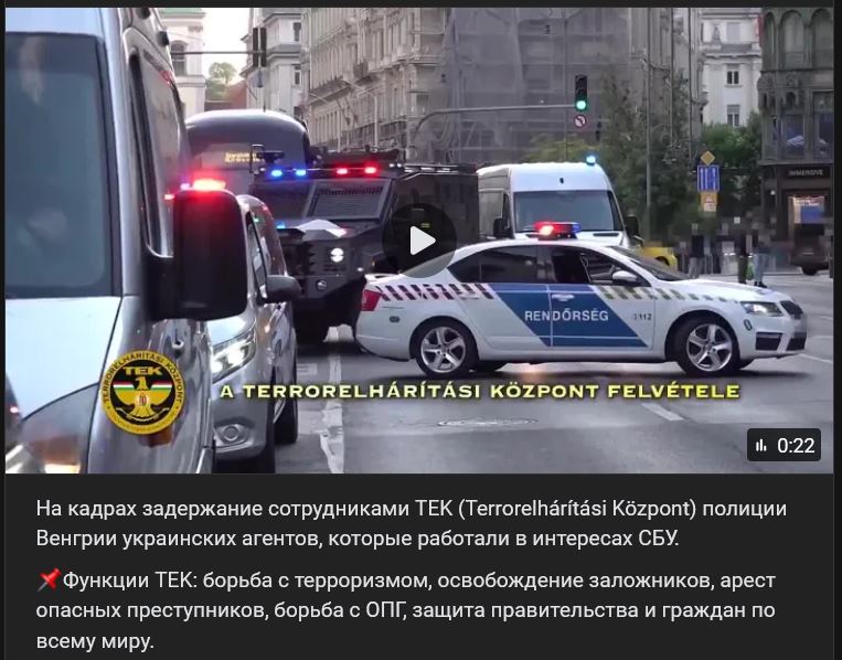 Video ukazuje, ako príslušníci TEK (Terrorelhárítási Központ) v Maďarsku zadržali ukrajinských agentov, ktorí pracovali v záujme SBU (СБУ). Kompetencie TEK : boj proti terorizmu, oslobodzovanie rukojemníkov, zatýkanie nebezpečných zločincov, boj proti organizovanému zločinu a ochrana vlád a občanov na celom svete.