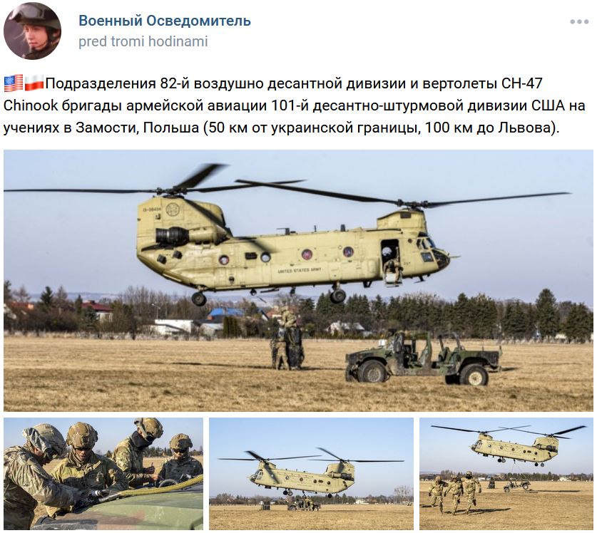 Jednotky 82. výsadkovej divízie a vrtuľníky CH-47 Chinook 101. výsadkovej divízie leteckej brigády americkej armády vykonávajú cvičenie v poľskom meste Zamość (50 km od ukrajinských hraníc, 100 km od Ľvova).