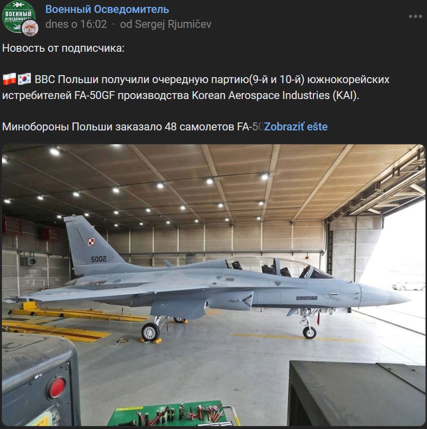 Poľské vzdušné sily dostali ďalšiu várku (9. a 10. lietadlo) juhokórejských lietadiel FA-50GF vyrobených spoločnosťou Korea Aerospace Industries (KAI). Poľské ministerstvo obrany objednalo 48 lietadiel FA-50 v roku 2022. Prvé z nich boli Poľsku dodané v 06/2023 na 23. základni taktického letectva. Do konca roka 2023 by mali dostať celkovo 12 lietadiel FA-50GF. Ďalších 36 lietadiel bude v "polonizovanej" konfigurácii FA-50PL ...