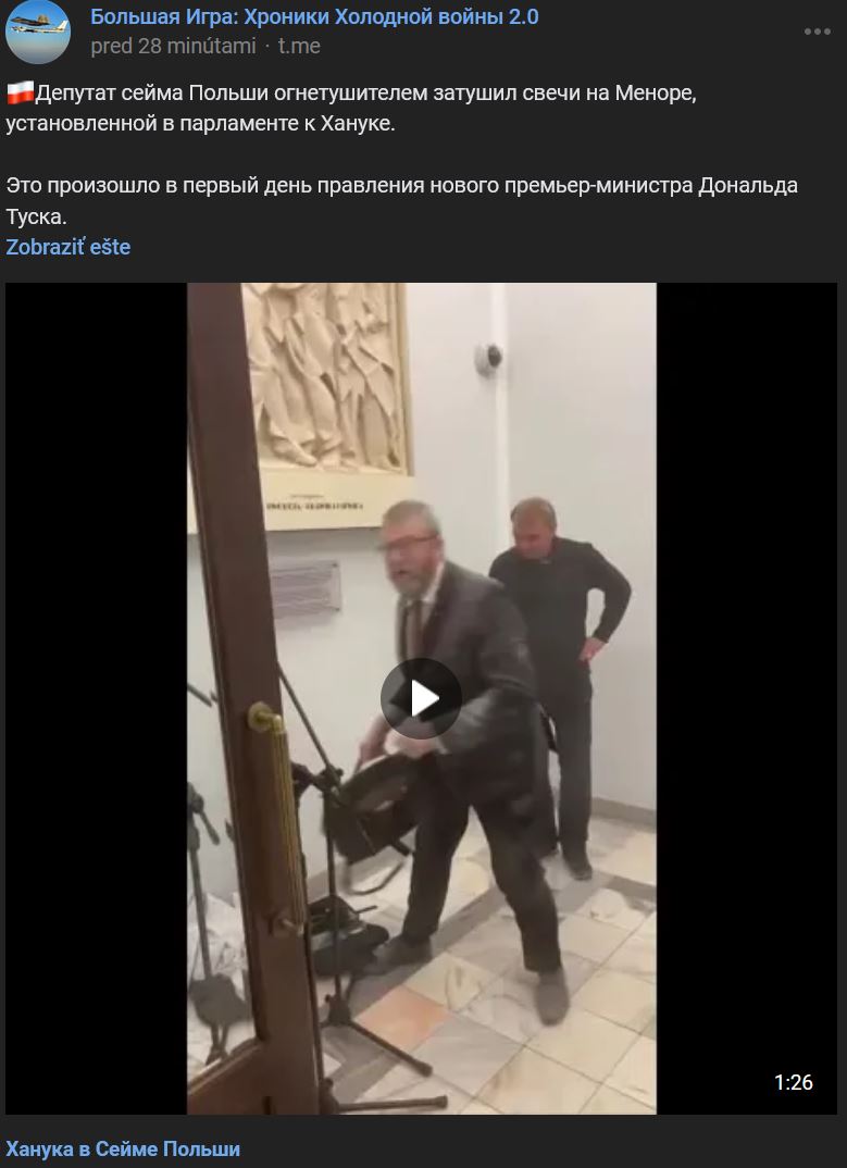 Poslanec poľského Sejmu použil hasiaci prístroj, aby uhasil sviečky na Menore, ktorá bola umiestnená v parlamente na Chanuku. Stalo sa tak v 1. deň pôsobenia nového premiéra Donalda Tuska. Grzegorz Braun (karta poslanca), líder monarchistickej "Konfederácie poľskej koruny" (Konfederacja Wolność i Niepodległość) (od jej založenia je súčasťou pravicovej "Konfederácie", ktorá je súčasťou opozície, ktorá vyhrala voľby), vzal hasiaci prístroj a zhasol Menoru, držiak na 7 sviečok, ktorý sa považuje za jeden zo symbolov judaizmu. Brauna následne vyhodili z budovy. "Je to neslušné, agresívne a hlúpe. Už dlho sa tu nič podobné nestalo. A už sa to nikdy nestane," povedal Szymon Hołownia (Marszałek Sejmu Rzeczypospolitej Polskiej).