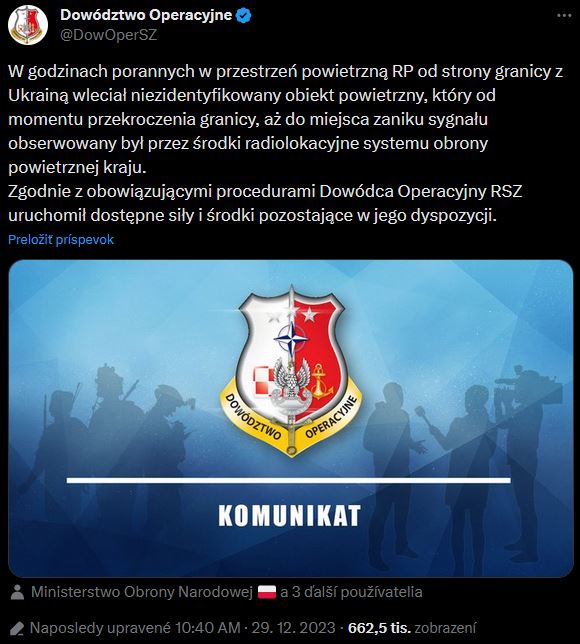 V piatok 29.12.2023 v ranných hodinách vletel do vzdušného priestoru Poľskej republiky zo strany hraníc s Ukrajinou neidentifikovaný vzdušný objekt, ktorý bol od momentu prekročenia hranice až do zmiznutia signálu pozorovaný rádiolokačnými prostriedkami systému protivzdušnej obrany krajiny.