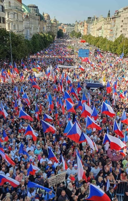Na Václavském náměstí se sešly desetitisíce lidí na demonstraci Česko proti vládě. Davy strhl ke skandování svým úvodním slovem předseda PRO Jindřich Rajchl. Ten odmítl výrok ministryně obrany o tom, že se lidé v ČR musí připravovat i na jadernou válku s Ruskem.