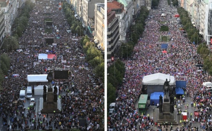 Vlevo – demonstrace Chvilkařů – 120.000 demokraticky smýšlejících lidí.