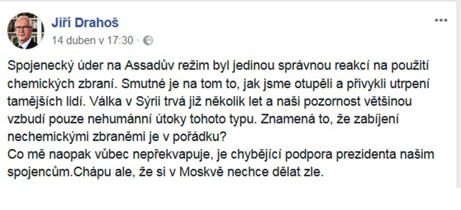 Premiér v demisi Andrej Babiš (ANO) v neděli po jednání s prezidentem Milošem Zemanem doplnil svá víkendová vyjádření ke spojeneckému zásahu v Sýrii, který původně označil za nevyhnutelný. Zkritizoval i své ministry, kteří se rovněž postavili na stranu spojenců, s tím, že se nejednalo o jednotné stanovisko vlády.