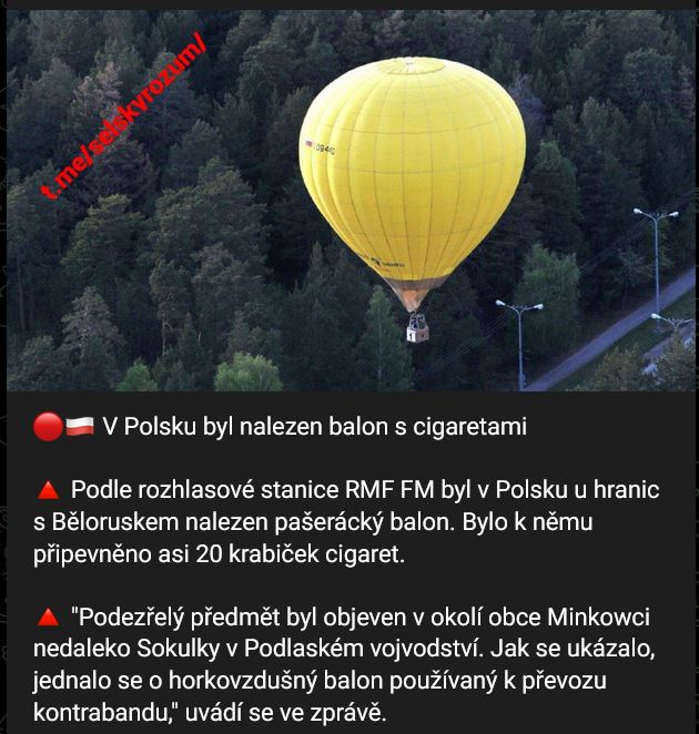 Zdroj https://t.me/selskyrozum/80118 z 10.03.2024Podle rozhlasové stanice RMF FM byl v Polsku u hranic s Běloruskem nalezen pašerácký balon. Bylo k němu připevněno asi 20 krabiček cigaret. "Podezřelý předmět byl objeven v okolí obce Minkowci nedaleko Sokulky v Podlaském vojvodství. Jak se ukázalo, jednalo se o horkovzdušný balon používaný k převozu kontrabandu," uvádí se ve zprávě.