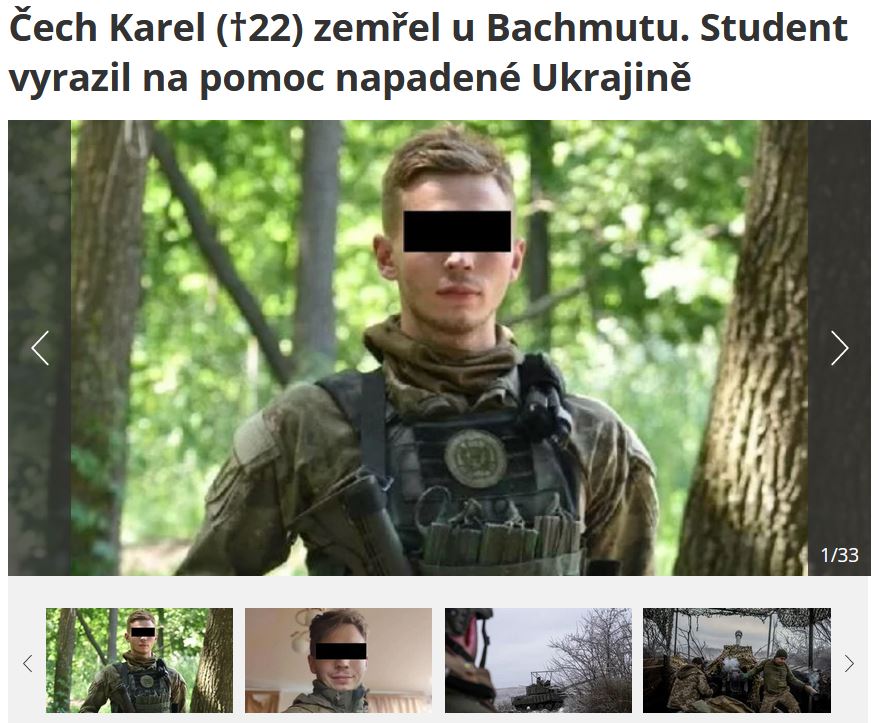 Zdroj https://www.blesk.cz/clanek/zpravy-valk ... ajine.html z 09.01.2024Facebooková stránka fungující jako memoriál padlých mezinárodních dobrovolníků bojujících po boku Ukrajinců oznámila, že v boji o Bachmut přišel o život Čech, 22 letý Karel K. Dojít k tomu mělo již 18.03.2023, 3 měsíce před jeho 23. narozeninami ... Rozcházely se přitom informace, v jaké části ukrajinské obrany byl přesně Karel K. nasazen. Podle informací zveřejněných v italském deníku La Stampa sloužil Karel K. v oblasti v elitní sniperské jednotce „Duchů z Bachmutu“, jeho matka Jana na internetu však později uvedla, že byl členem 3. batalionu, který je součástí zahraničních legií ... Mezi úmrtím samotným a oznámením, že Karel K. padl v boji, uplynulo téměř 10 měsíců ... Tato tvrzení popřela sama maminka Jana, podle které byla rodina již v 09/2023 v Javorivu řešit pozůstalostní věci...