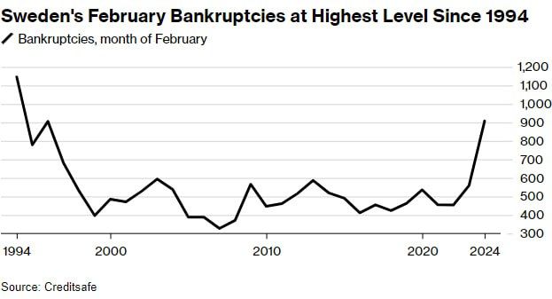 Počet bankrotů ve Švédsku do února 2024 vzrostl o 62 % oproti předchozímu roku a dosáhl nejvyšší hodnoty za posledních 30 let, uvedla agentura Bloomberg. Největší nárůst byl zaznamenán mezi hotely a restauracemi, následovaly poradenské firmy a společnosti ve stavebnictví.