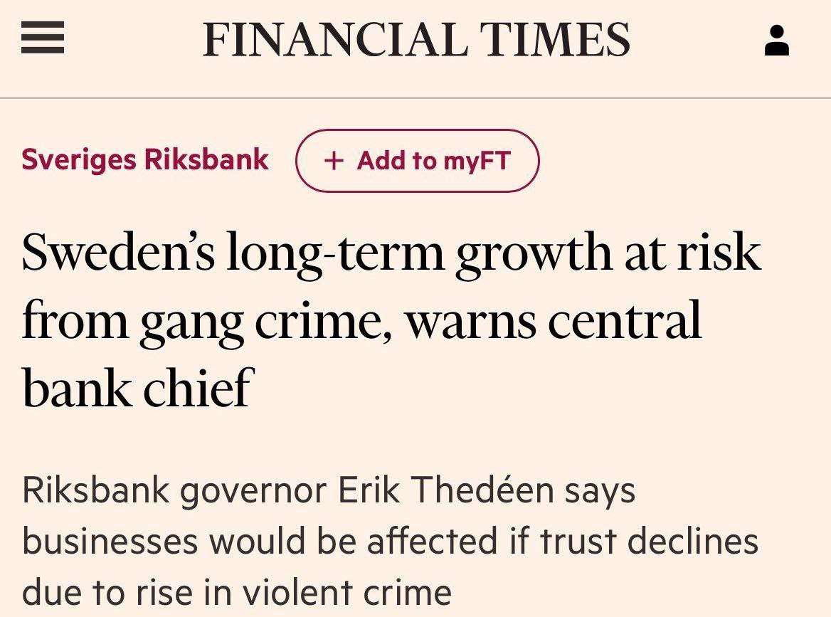 Švédsko má ekonomické problémy kvůli bující kriminalitě, uvedla místní centrální banka. @banksta