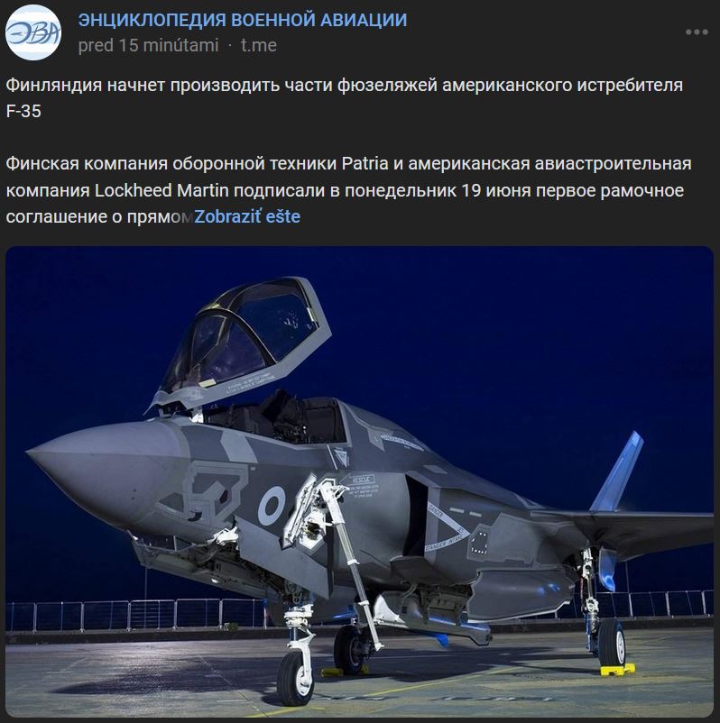 Fínska spoločnosť Patria vyrábajúca obranné zariadenia a americký výrobca lietadiel Lockheed Martin podpísali v pondelok 19.06.2023 prvú rámcovú dohodu o priamej priemyselnej spolupráci v rámci fínskeho nákupu 64 lietadiel F-35. Dohoda sa týka montáže predných častí trupu lietadiel F-35 vo Fínsku. Očakáva sa, že sa zmontuje celkovo 400 takýchto častí. Práce sa budú vykonávať v závode Patria Jamsa Hall.