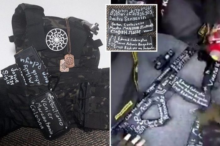 Snímky zveřejněného vybavení pachatele zobrazují z neznýmých příčin Slovanskou symboliku.