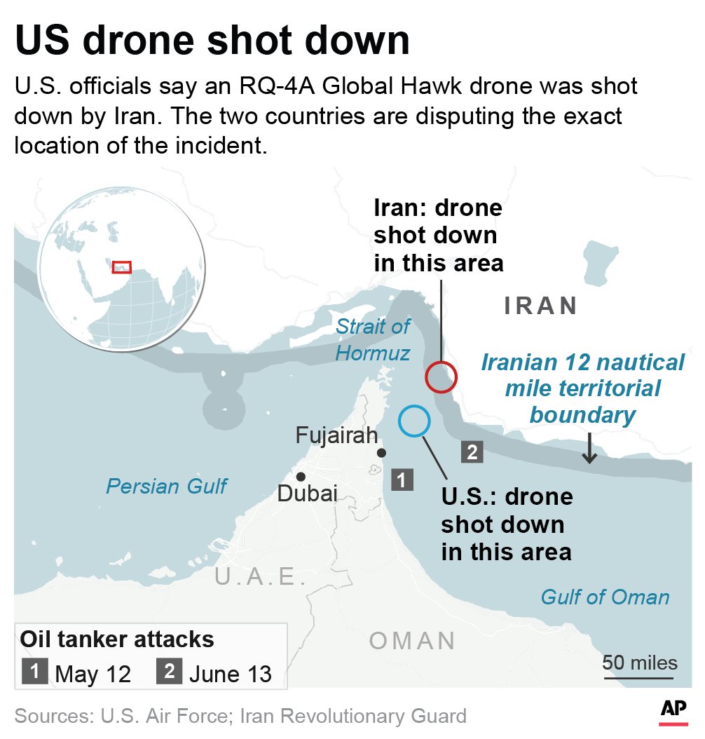 Írán uvedl, že sestřelil americký dron RQ-4 Global Hawk nad provincií Hormuzgán a zveřejnil i údajnou fotku sestřeleného stroje. Útok měly provést Íránské revoluční gardy. Americká oficiální místa odmítají zprávu íránské agentury IRNA blíže komentovat. Mluvčí amerického velitelství CENTCOM Bill Urban pouze sdělil agentuře AP, že ,,nad íránským územím neletěl žádný dron".