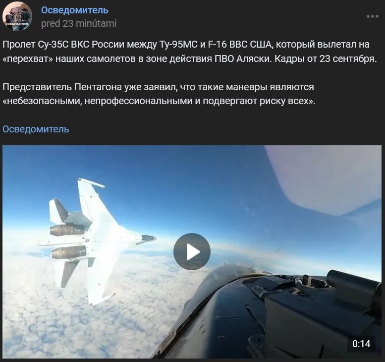 Video https://vk.com/video-123538639_456311654 dĺžka 15 sek.Prelet lietadla Suchoj Su-35S (Су-35С) VKS Ruska medzi lietadlom Tupolev Tu-95MS (Ту-95МС) a F-16 VVS SŠA, ktorá letela „zachytiť“ naše lietadlá v zóne PVO Aljašky. Zábery sú z pondelka 23.09.2024. Hovorca Pentagónu už povedal, že takéto manévre sú „nebezpečné, neprofesionálne a ohrozujú všetkých“.